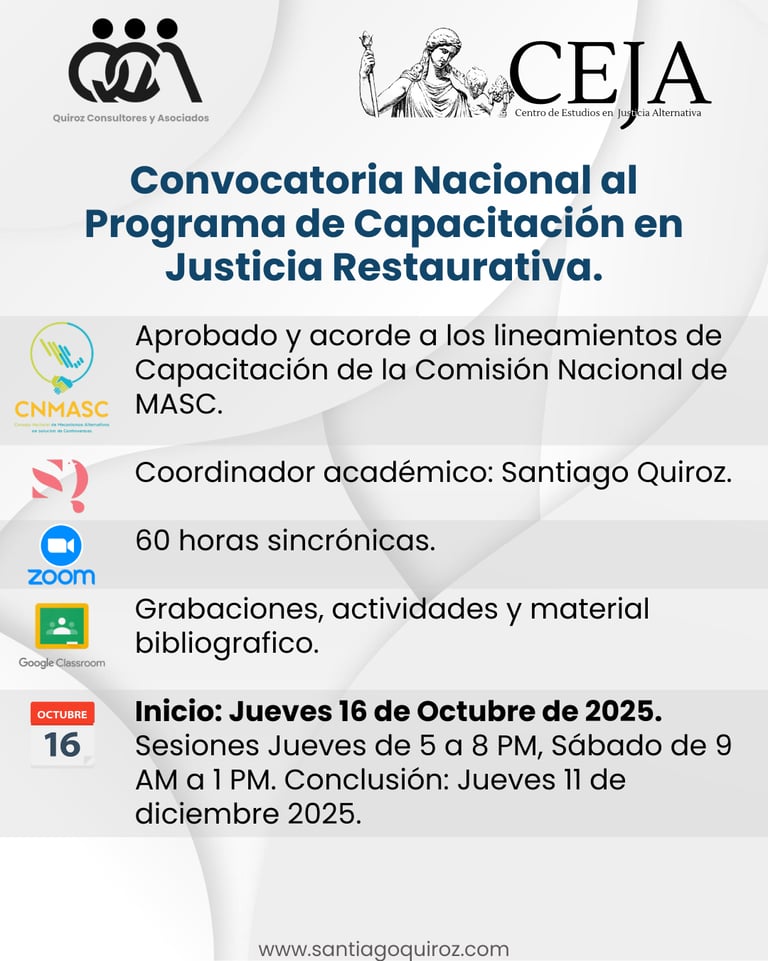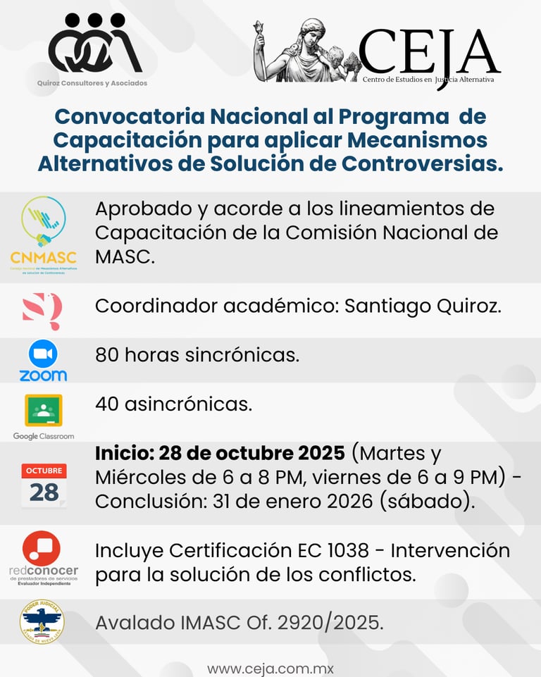 En el Centro de Estudios en Justicia Alternativa de Quiroz Consultores y Asociados, nos dedicamos a profesionalizar el acceso a la justicia mediante la formación y certificación en diversas competencias legales.