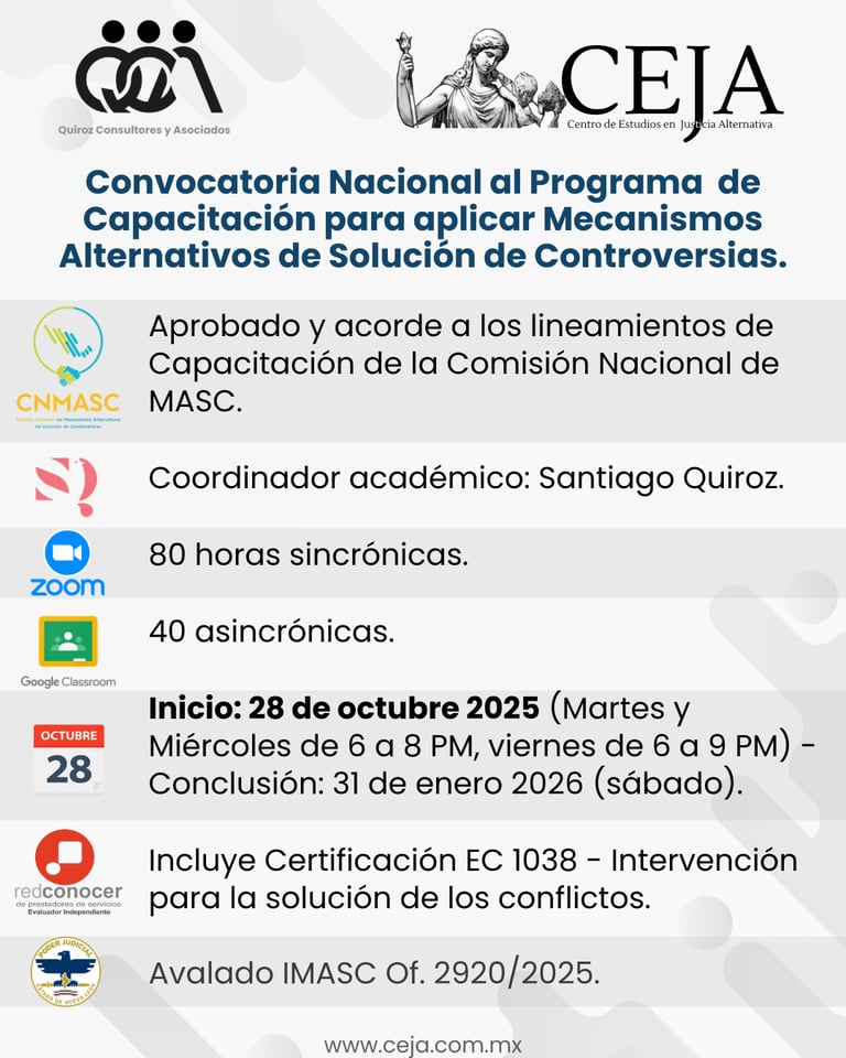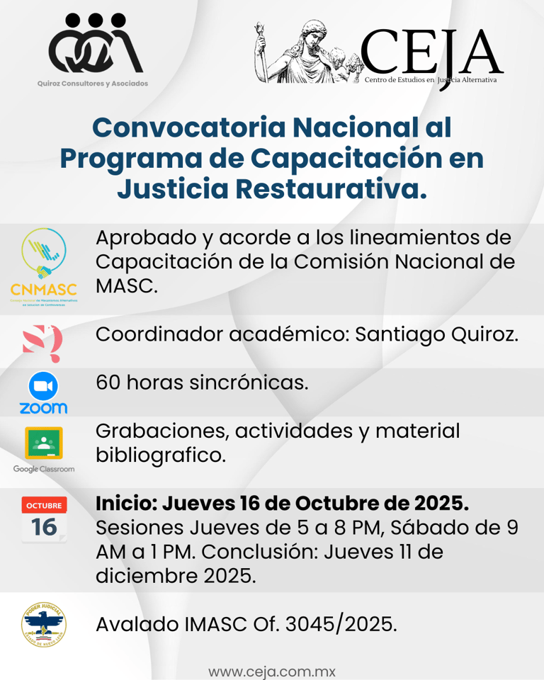 Conoce nuestras convocatorias para formación inicial de 120 horas conforme a los Lineamientos de Capacitación de la CNMASC y la especialización de 60 horas en Justicia Restaurativa.